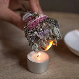Tilt the bundle at a slight angle, light the end, and gently blow out the flame. Allow the smoke to rise and cleanse your body and space, moving with intention, prayer, or quiet reflection.