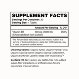 Support a healthy immune system, strong bones, and a balanced mood with 2,000 IU of plant-based and organic Vitamin D3 in one small & subtly sweet vanilla chewable tablet. Your Vitamin D is now even easier and more enjoyable to take every day - no water needed!