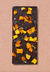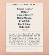 Mango Chili: Organic Cacao Beans, Organic Dates, Organic Cacao Butter, Dried Mango, Urfa Chile, Black Lime, Flake Salt