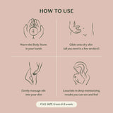 Glide the bar directly onto skin — legs, arms, torso or dry spots like elbows and knees. The body-heat will melt the bar into a nourishing oil.