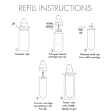 Bioidentical Collagen Serum is available in a 1oz airless glass bottle and includes a full refill cartridge. This internal cartridge can easily be removed and replaced with a new, full cartridge once the original cartridge is emptied. Additional cartridges are available for purchase independently from the bottle, but the refill is not usable without the bottle.