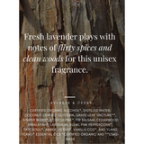 Lavender & Cedar is a sultry, unisex fragrance that blends dark, earthy lavender with clean woods and flirty spices for an irresistible allure. Sexy and woody, this scent opens with the fresh, invigorating notes of juniper berry, Scotch pine, and fir balsam, creating a natural, rugged backdrop. As it evolves, warm cedarwood and rich labdanum are enhanced by the subtle spice of pink peppercorn and the sensual depth of patchouli. A touch of amber, vanilla, and vetiver adds smooth, musky warmth, while a hint of ylang ylang brings a delicate floral edge. Loved by men, adored by women, Lavender & Cedar is the perfect balance of bold and seductive.