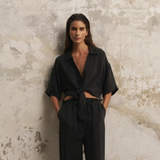 Effortless with a touch of modern sophistication, this tie-front shirt is designed for both ease and elegance. Featuring a relaxed, slightly cropped silhouette with a collared neckline, oversized short sleeves, and a statement tie-front detail, it’s crafted from a luxurious fabric that offers a subtle sheen.