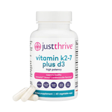 Because Vitamin D deficiency is common and K2 intake is often overlooked, Just Thrive created a high-potency formula that delivers both nutrients together in their most bioavailable forms. Each vegetable capsule provides 125mcg of Vitamin D3 and 200 mcg of Vitamin K2-7 (menaquinone-7) to support immune strength, cardiovascular wellness, and strong, healthy bones.