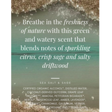 Sea Salt & Sage invites you to breathe in the refreshing essence of nature with its green, watery scent. Sparkling citrus and crisp sage create an invigorating opening, while the earthy notes of salty driftwood and grounding vetiver bring a natural, coastal freshness. Soft florals like lavender and gardenia intertwine with hints of amber and chamomile, adding depth and serenity to the fragrance. Fresh, clean, and airy, this scent leaves you feeling revitalized and connected to the outdoors, like a breath of fresh air by the sea.